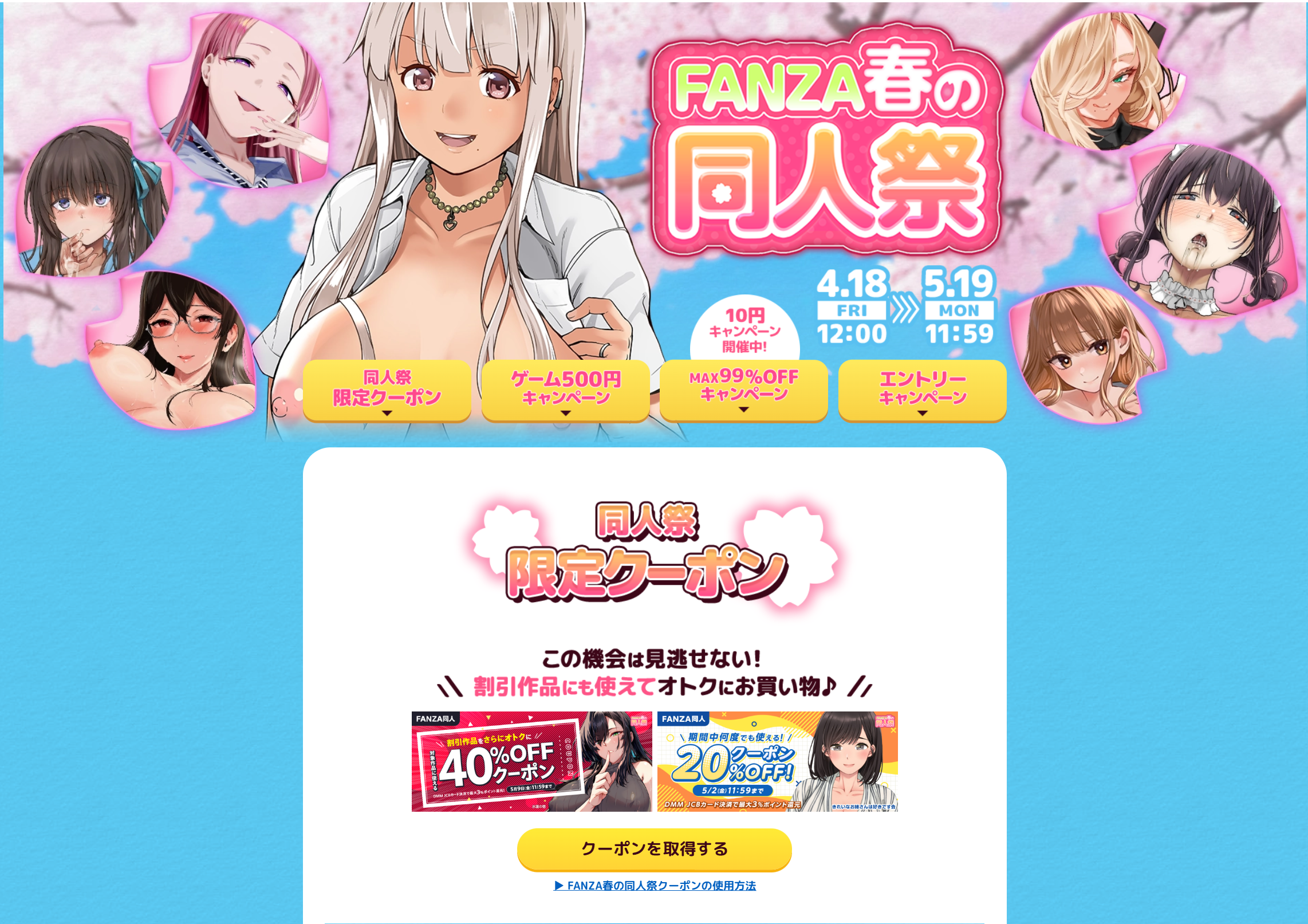 FANZA春の同人祭が開催!MAX99%OFF作品がクーポン利用でさらにお得に!2025年5月19日(月)11:59まで!